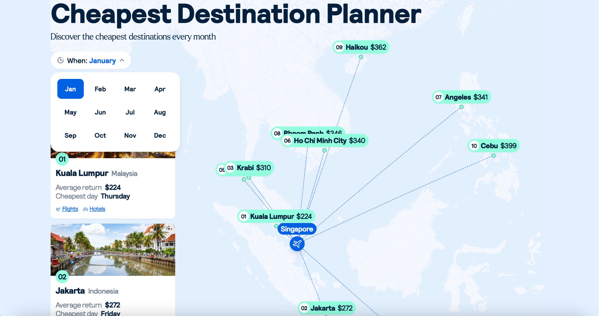 The planner is a fuss-free, easy tool to use too. All you need to do is simply select the month you want to travel, and the planner will compile a list of the top 10 cheapest destinations for the month, along with the day that is cheapest to travel and the average price for a return flight. Once you’ve selected your destination, you just need to click through to explore more flights or hotel options.