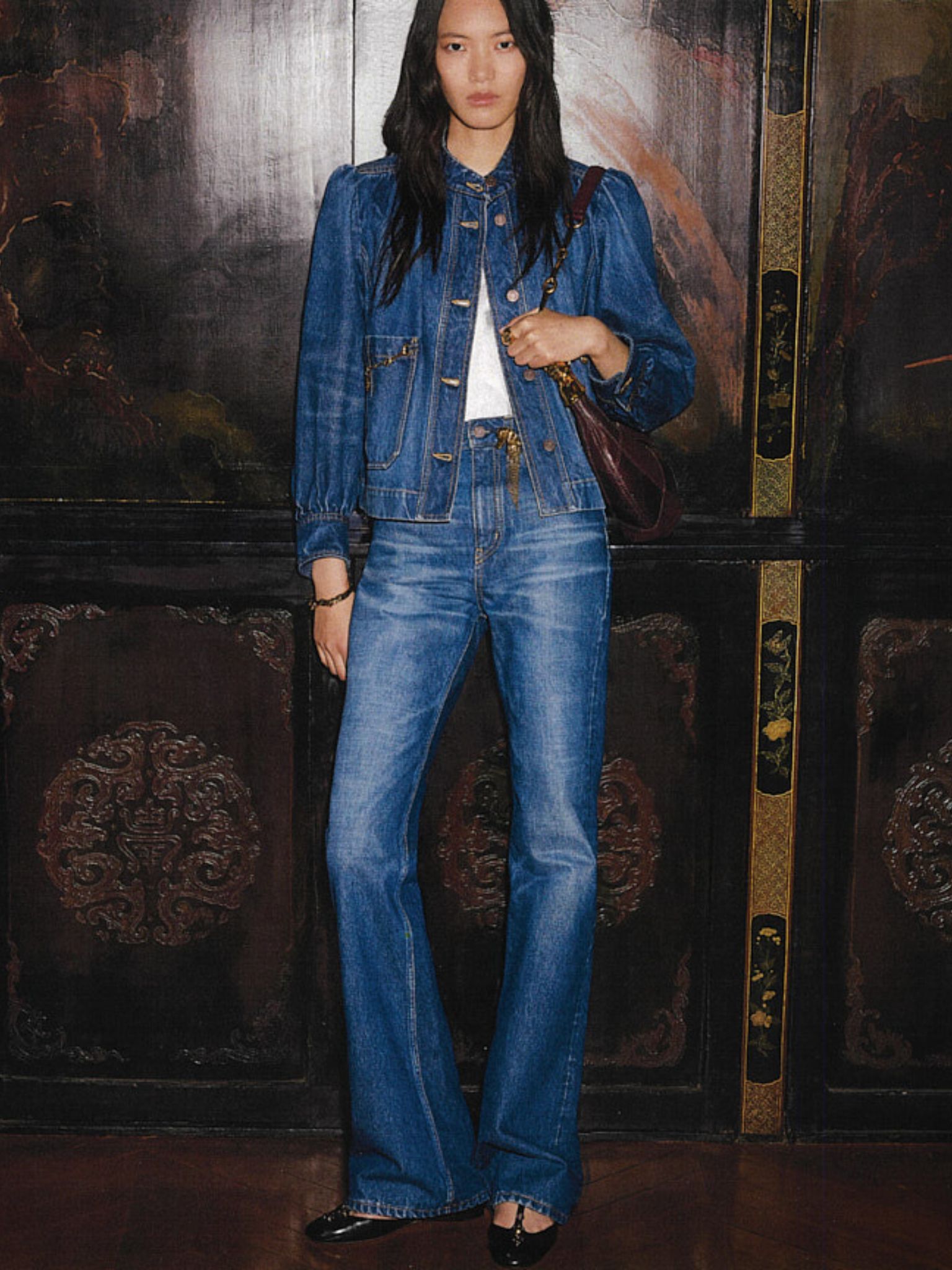 Ready-to-wear pieces include everyday essentials such as t-shirts, knitwear and denim designs, as well as detailed pieces such as a high-necked jacket with gathered sleeves that fastens with equestrian-inspired buckles, and denim looks with horse buttons and Chloé-embossed brass rivets.