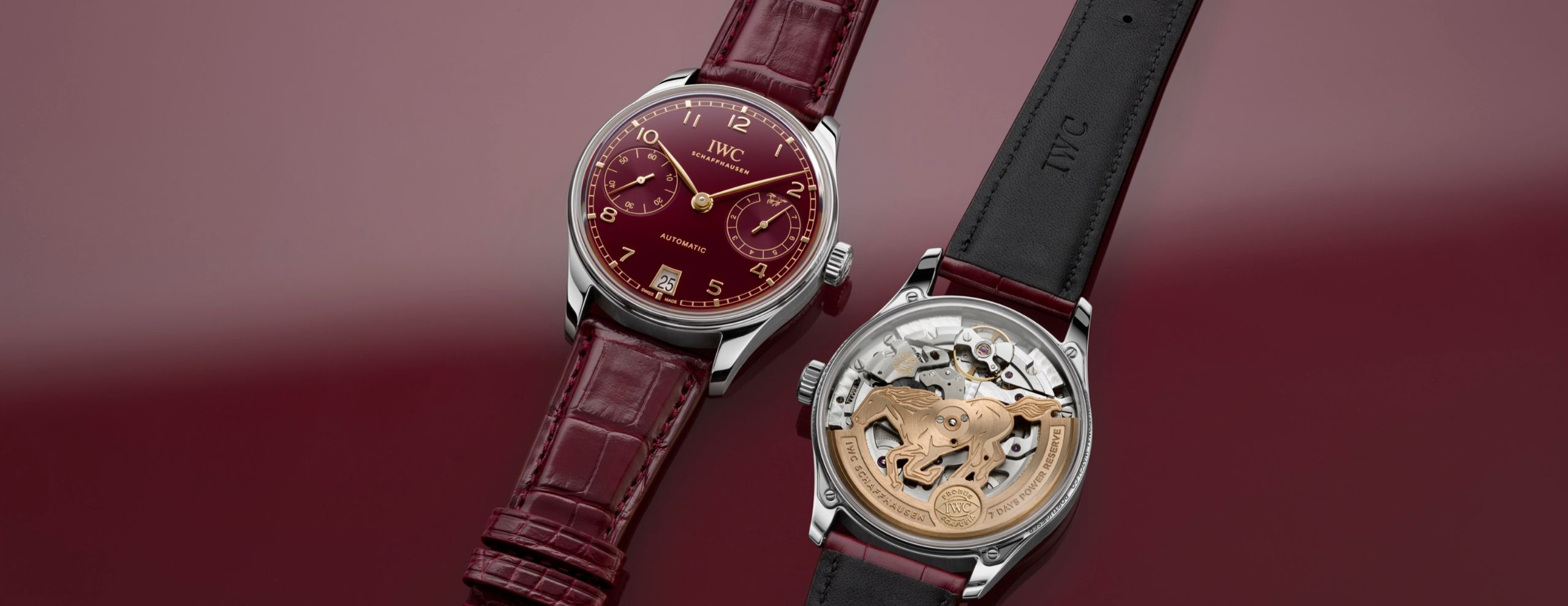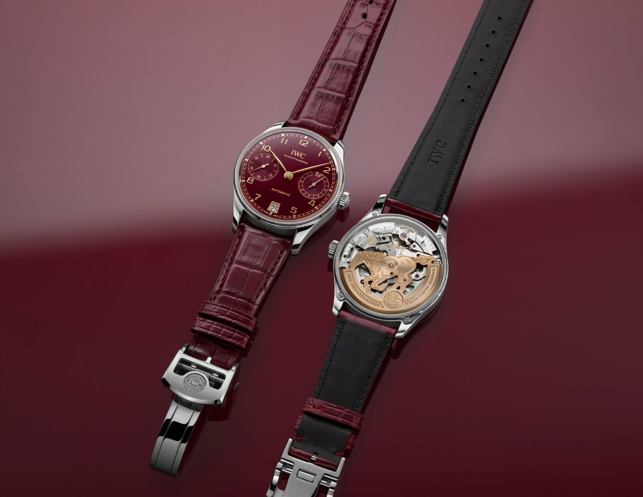 Inspired by the auspicious red tones of the Lunar New Year, the burgundy dial showcases the characteristic and well-balanced Portuguese design; paying homage to the first Portugieser design with the small seconds at 9 o’clock and the power reserve display at 3 o’clock.
