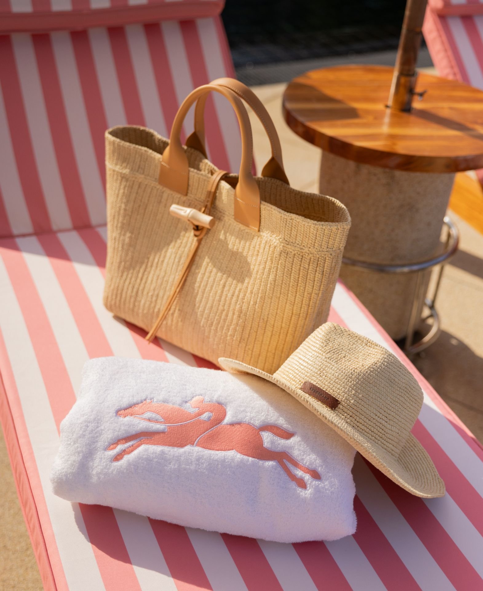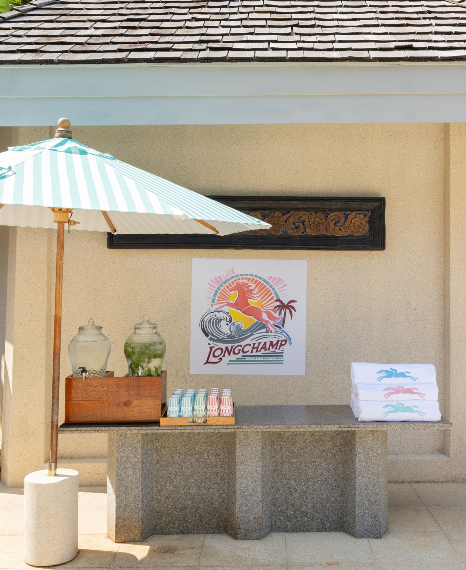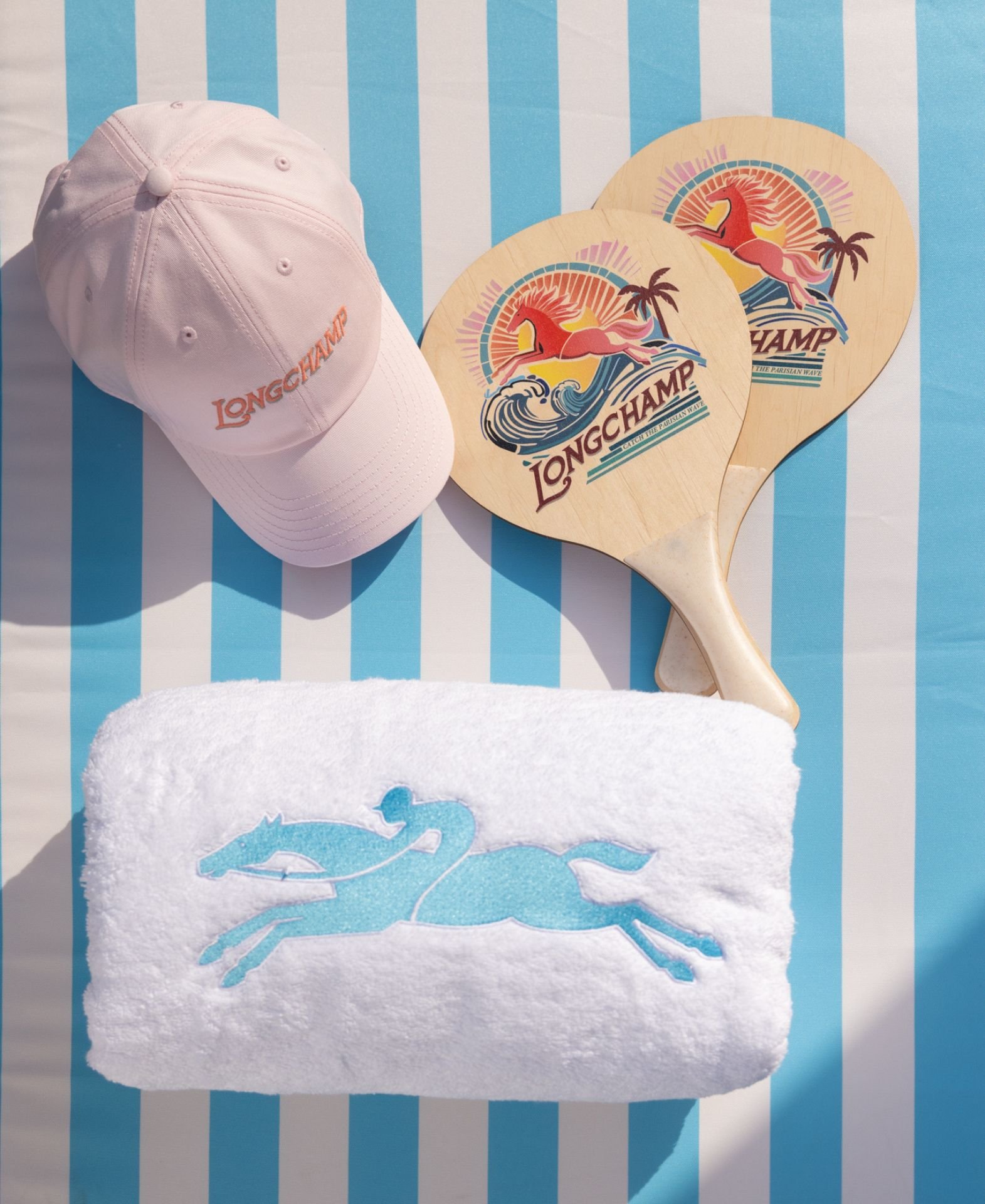 For summer, Longchamp’s logo is depicted with the iconic racehorse and its flowing mane and tail, riding the wave with flair and panache — an evocation of the energy of surf culture. This logo also features on a lineup of Summer 2026 ready-to-wear pieces, that are on show at the pop-up, to give you a chance to discover Longchamp designs in a novel context.
