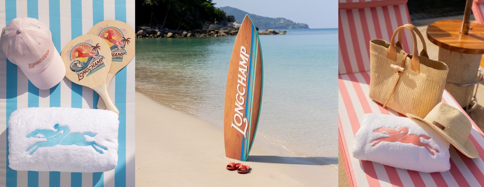 Within the space, you’ll find striped deck chairs, beach rackets, kites and beach volleyballs, alongside special-edition Longchamp surfboards, that embody a spirit of freedom and dynamism, while inviting you to relax.