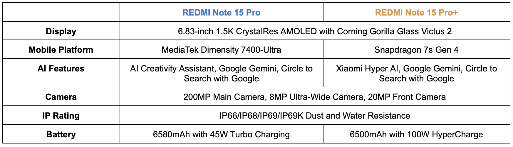Engineered to deliver REDMI Titan Durability, the new Note 15 Pro and Pro+ are built with exceptional battery experience, drop resistance and protection, and comprehensive dust and water resistance into a design that is built for everyday use.